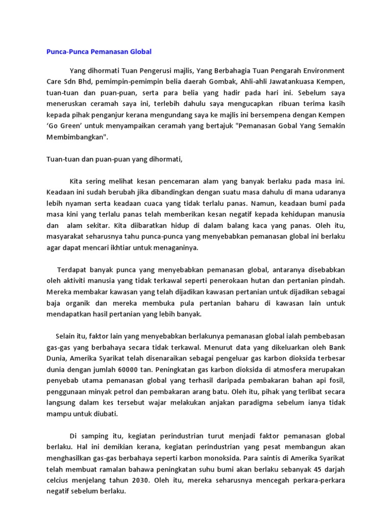 Kajian mendapati kawasan artik lebih pantas menjadi panas berbanding kawasan lain. Pemanasan global atau pemanasan sejagat berkaitan dengan peningkatan suhu dunia. Selain daripada penyebab yang dihasilkan dari faktor di atas, ketahuilah dampak berbahaya lain dari pemanasan global seperti pembahasan di bawah ini Faktor terjadinya pemanasan global di bumi. Semoga dengan adanya pembahasan ini dapat menambah wawasan dan pengetahuan untuk kita semua, dan kami ucapkan terima kasih telah menyimak ulasan kami. Gas ini banyak dihasilkan oleh pembusukan materi organik, seperti kotoran hewan ternak atau sisa tanaman yang membusuk. Penyebab pemanasan global ini ada beberapa faktor. Yuk langsung kita simak artikel mengenai. Suhu bumi telah meningkat dua darjah dan kadarnya berbeza mengikut benua dan kawasan tertentu. Meningkatnya jumlah karbondiaksida , gas akibat pembakaran bahan bakar fosil, efek rumah kaca, dan aktivitas manusia lainnya, adalah sumber utama terjadinya pemanasan global. Faktor yang bisa menyebabkan pemanasan global antara lain yaitu emisi co2, emisi metana, deforestation, dan pembakaran lahan hutan, penggunaan chlorofluorocarbons (cfcs), meningkatnya penggunaan pupuk kimia dalam pertanian. Entah itu yang membawa dampak positif maupun yang negatif. 2 faktor penyebab pemanasan global.