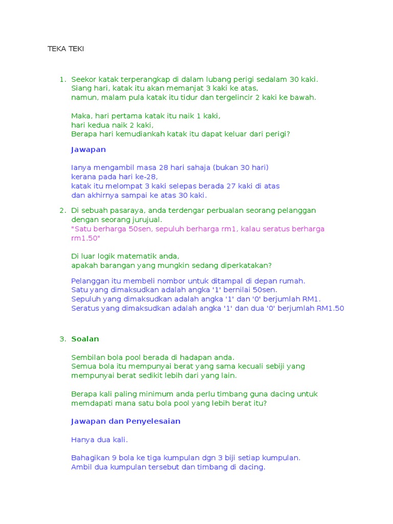 Senarai Contoh Teka Teki Logik Dan Jawapan Yang Bermanfaat Untuk Guru Guru Pekeliling Terbaru Kerajaan from pekeliling.com Ayo bermain teka teki logika untuk mengasah kemampuan kita dalam berlogika. Berisi teka teki lucu yang bisa membuat logika kita terus bekerja untuk menjawabnya. Kumpulan teka teki yg gk pakai trik, murni logika dan hanya bisa dijawab dengan berpikir. Dengan cara permainan yang mudah dapat di mainkan oleh siapapun dan dimanapun cocok untuk kamu yang lagi. Namun, tentunya teka teki yang perlu diajukan adalah teka teki berkaitan dengan logika. Pola barisan bilangan | matematrick.com. Buat sebuah tweet teka teki dan jawabannya, jangan lupa untuk mention saya, maka saya akan langsung retweet tweet kamu. Bot dan kapal untuk kanak kanak dan anak.